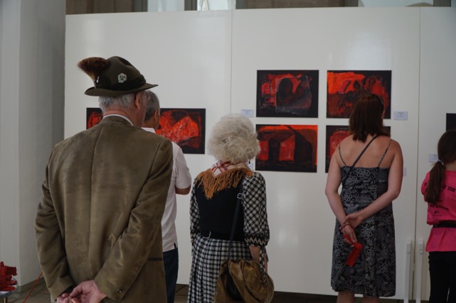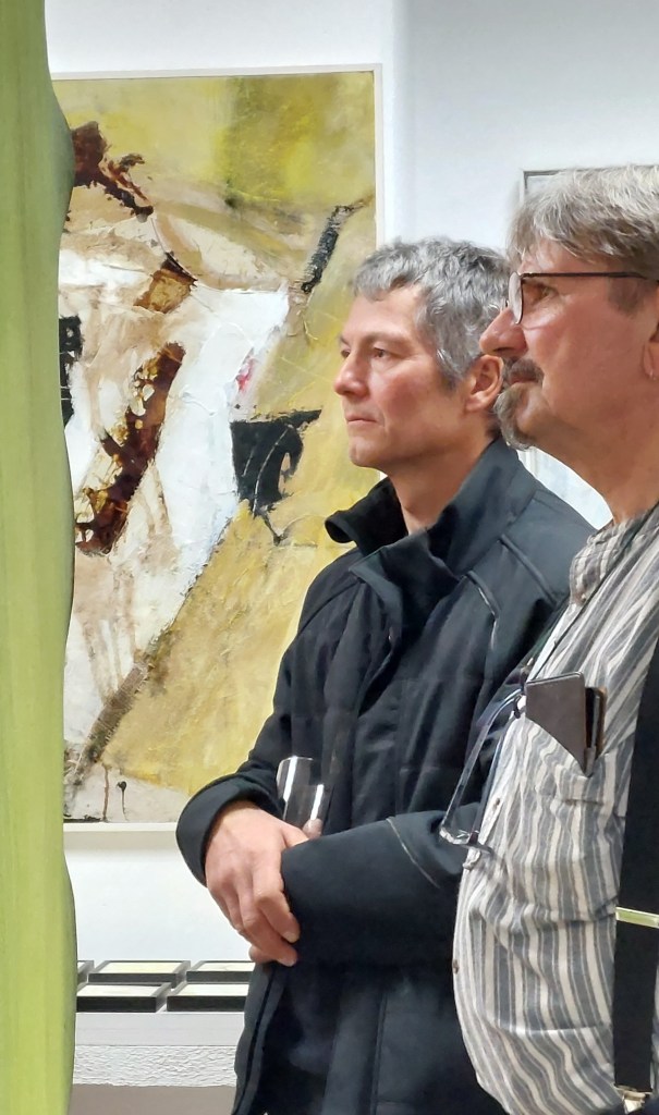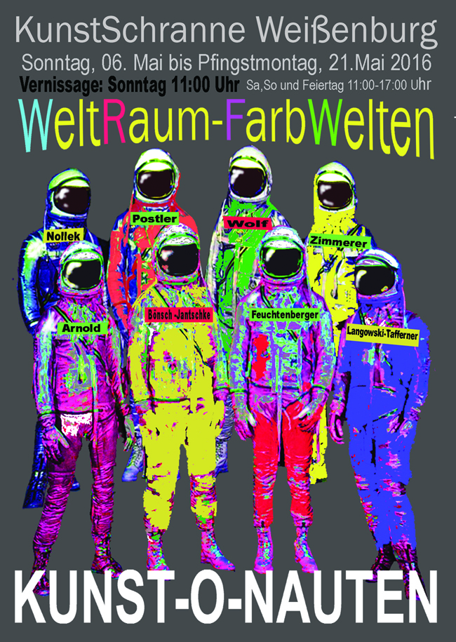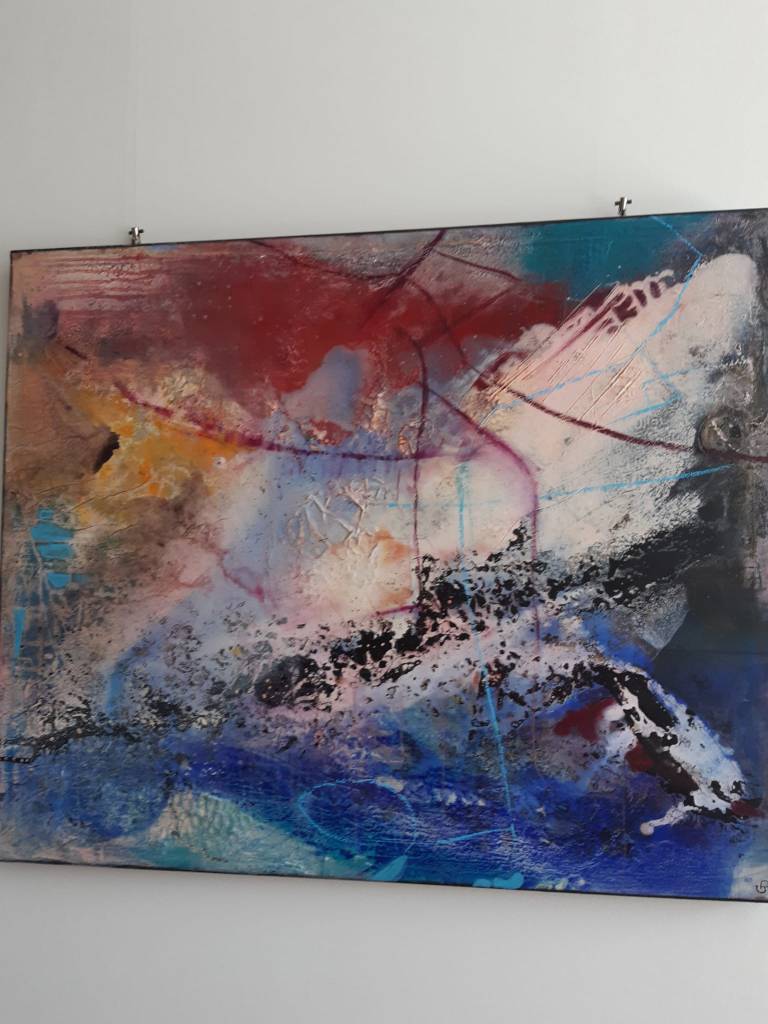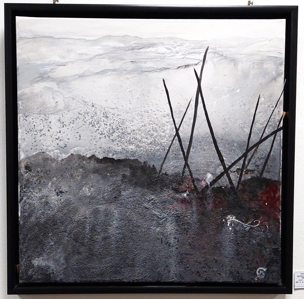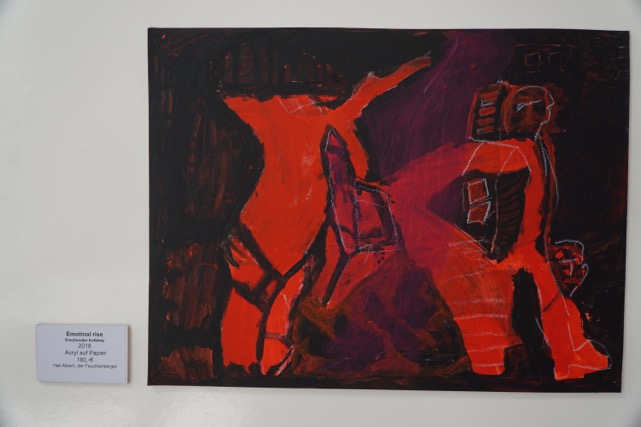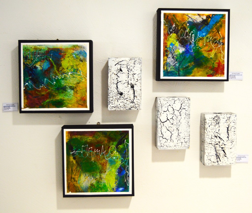 Auch Gerhard Postler betitelt so einige seiner Werke. Beide hatten sich hier zusammengetan und das Thema Weltall bearbeitet. Wahre Farbexplosionen sind zu sehen, diese leuchtenden Farbvariationen scheinen sich zu verschlingen, auseinander zu driften und zu implodieren – entstehen so die Schwarzen Löcher? Gegenüber ist sein Menschenbild zu sehen, versteckt im farbigen Umfeld steht das Individuum nicht mehr als Einzelperson, sondern als Gruppe, wir alle gehören zusammen und müssen uns dem Leben stellen, ist die Botschaft des Gunzenhausener Künstlers.
