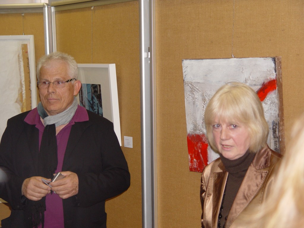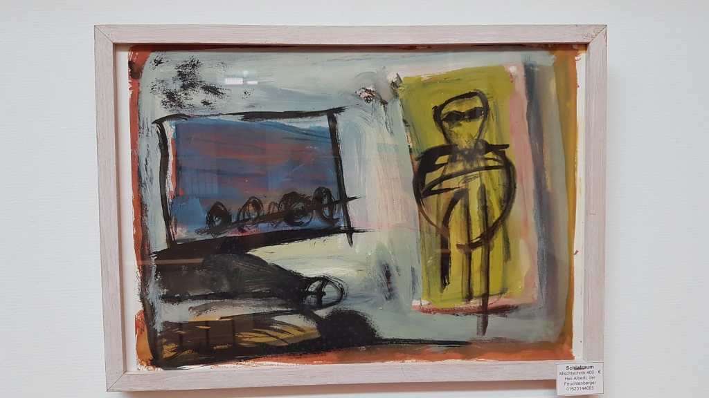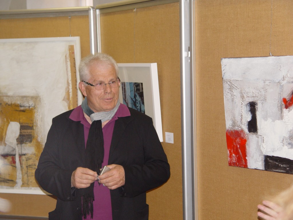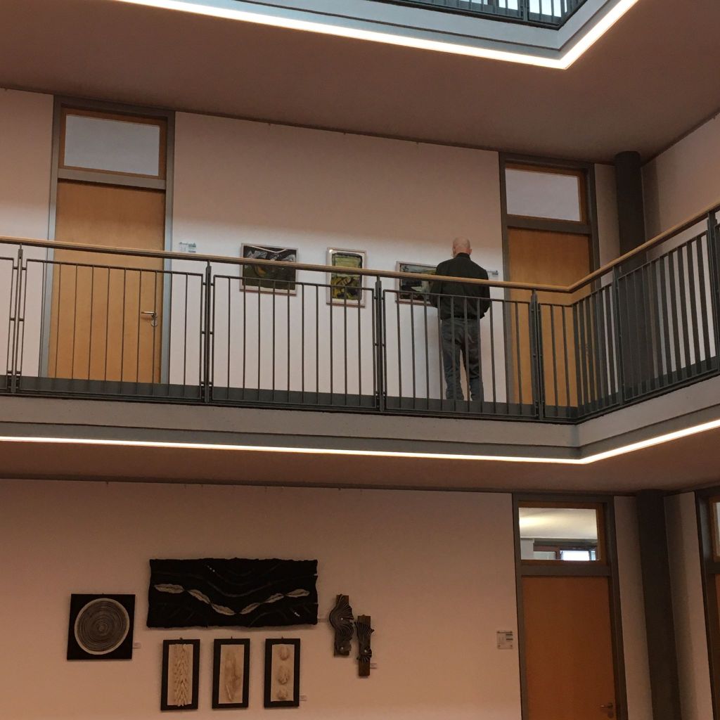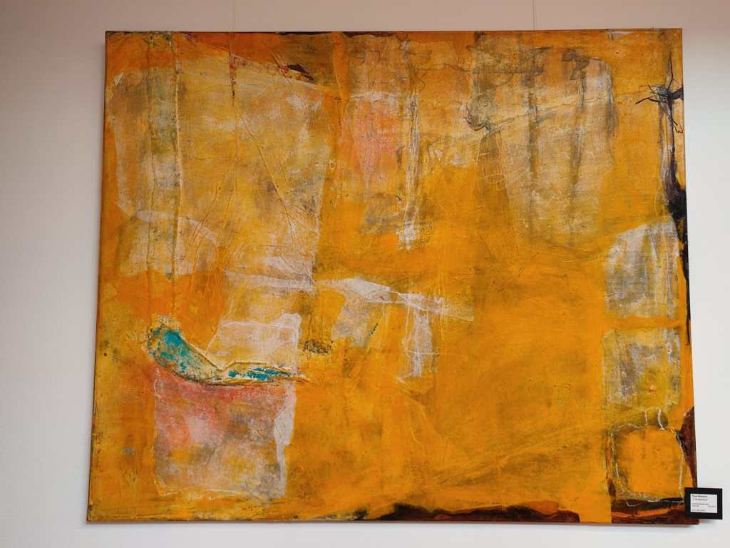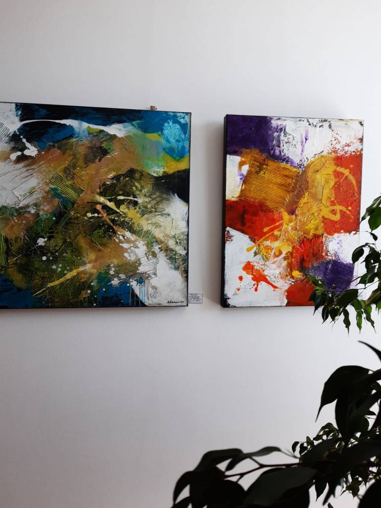 Auch Gerhard Postler betitelt so einige seiner Werke. Beide hatten sich hier zusammengetan und das Thema Weltall bearbeitet. Wahre Farbexplosionen sind zu sehen, diese leuchtenden Farbvariationen scheinen sich zu verschlingen, auseinander zu driften und zu implodieren – entstehen so die Schwarzen Löcher? Gegenüber ist sein Menschenbild zu sehen, versteckt im farbigen Umfeld steht das Individuum nicht mehr als Einzelperson, sondern als Gruppe, wir alle gehören zusammen und müssen uns dem Leben stellen, ist die Botschaft des Gunzenhausener Künstlers.