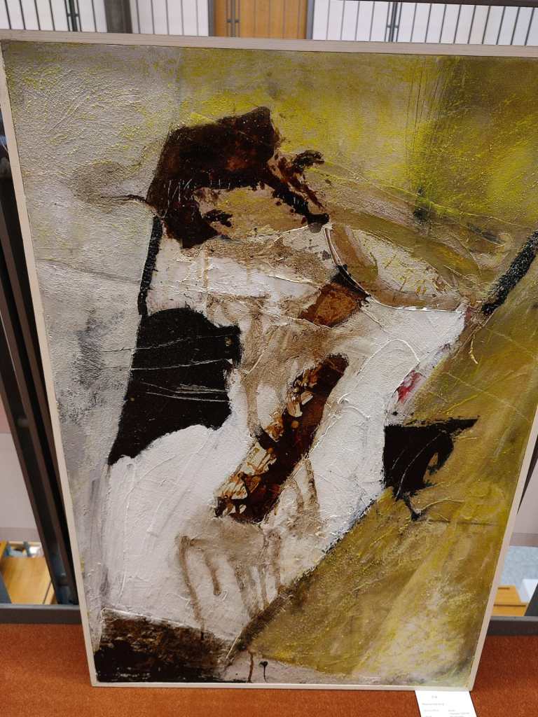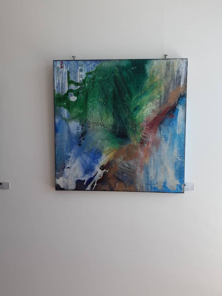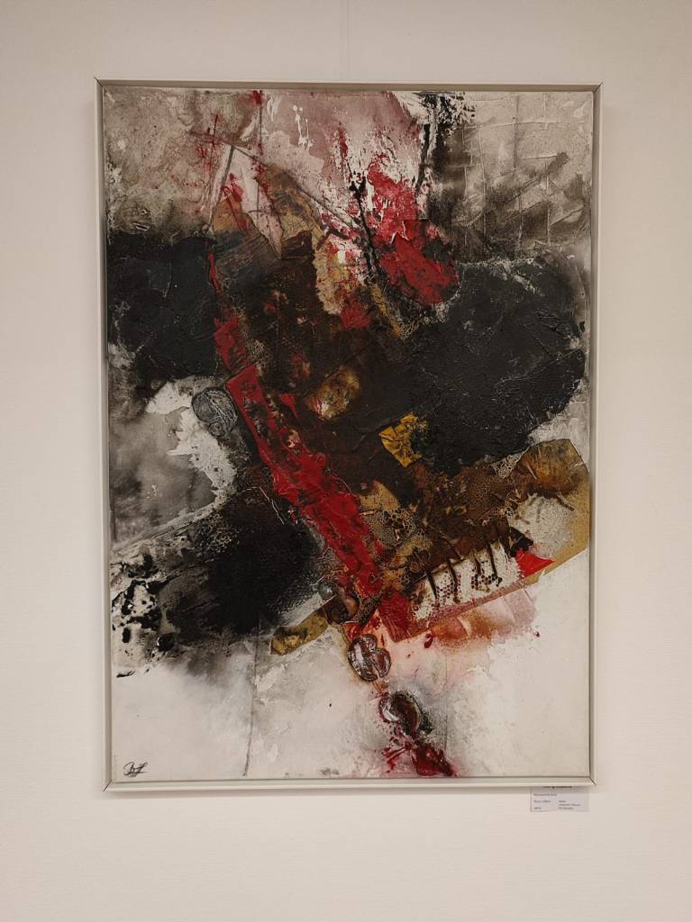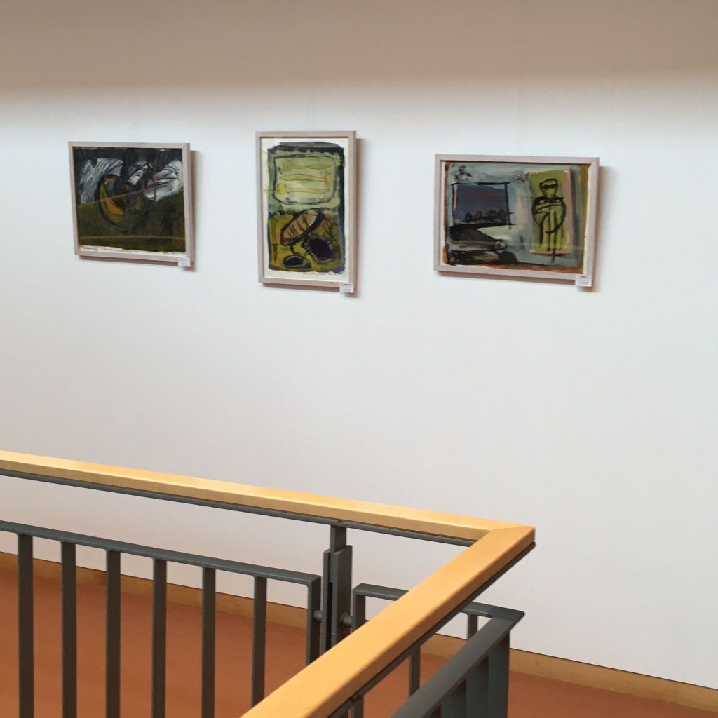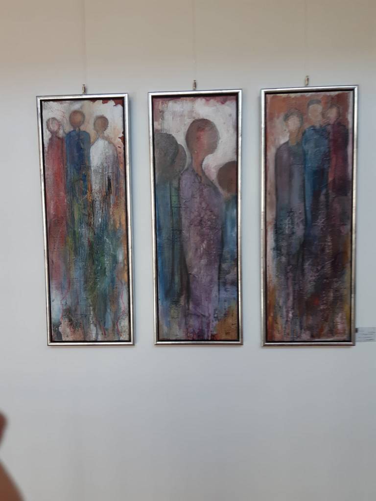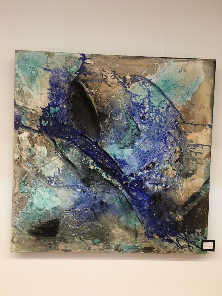 Auch Gerhard Postler betitelt so einige seiner Werke. Beide hatten sich hier zusammengetan und das Thema Weltall bearbeitet. Wahre Farbexplosionen sind zu sehen, diese leuchtenden Farbvariationen scheinen sich zu verschlingen, auseinander zu driften und zu implodieren – entstehen so die Schwarzen Löcher? Gegenüber ist sein Menschenbild zu sehen, versteckt im farbigen Umfeld steht das Individuum nicht mehr als Einzelperson, sondern als Gruppe, wir alle gehören zusammen und müssen uns dem Leben stellen, ist die Botschaft des Gunzenhausener Künstlers.