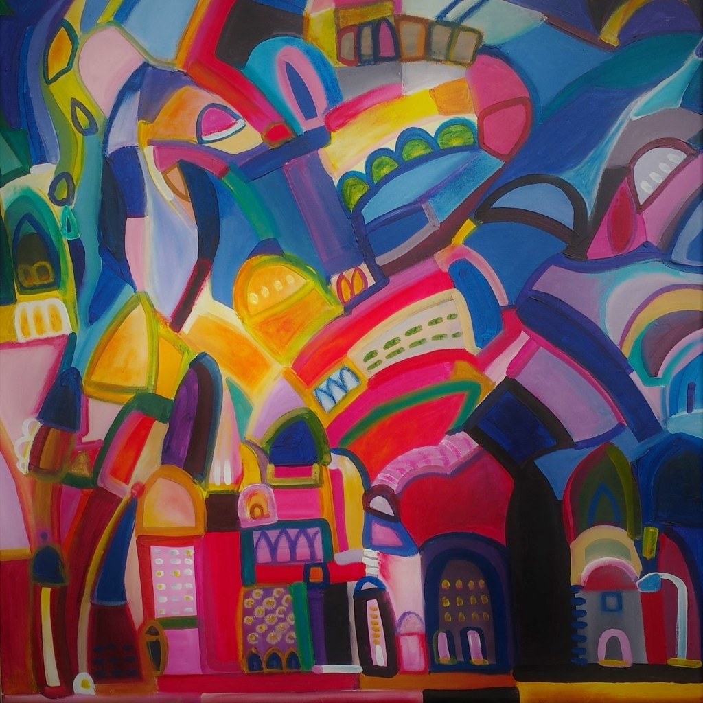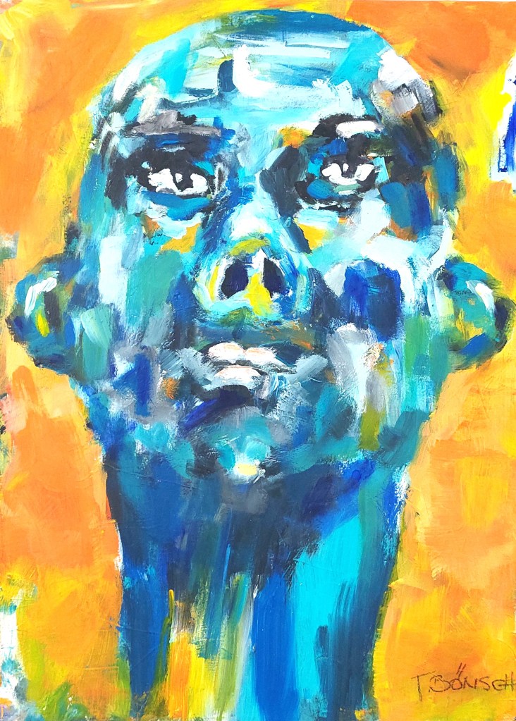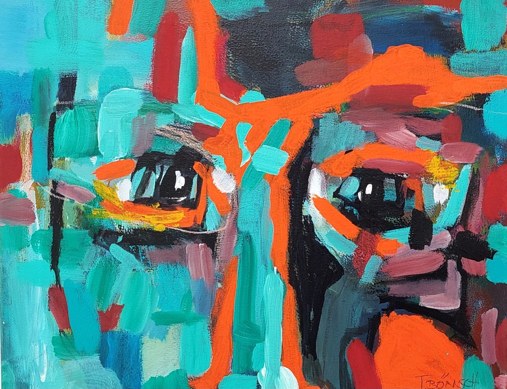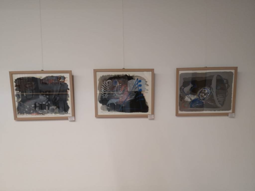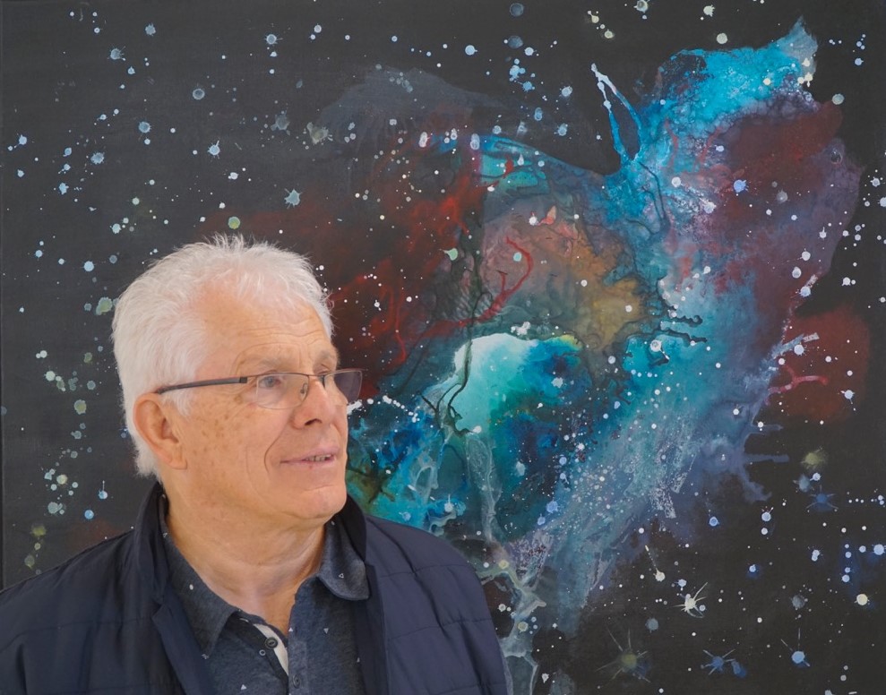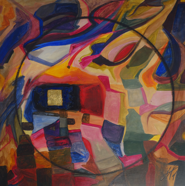 Auch Gerhard Postler betitelt so einige seiner Werke. Beide hatten sich hier zusammengetan und das Thema Weltall bearbeitet. Wahre Farbexplosionen sind zu sehen, diese leuchtenden Farbvariationen scheinen sich zu verschlingen, auseinander zu driften und zu implodieren – entstehen so die Schwarzen Löcher? Gegenüber ist sein Menschenbild zu sehen, versteckt im farbigen Umfeld steht das Individuum nicht mehr als Einzelperson, sondern als Gruppe, wir alle gehören zusammen und müssen uns dem Leben stellen, ist die Botschaft des Gunzenhausener Künstlers.