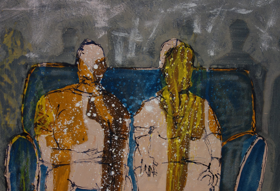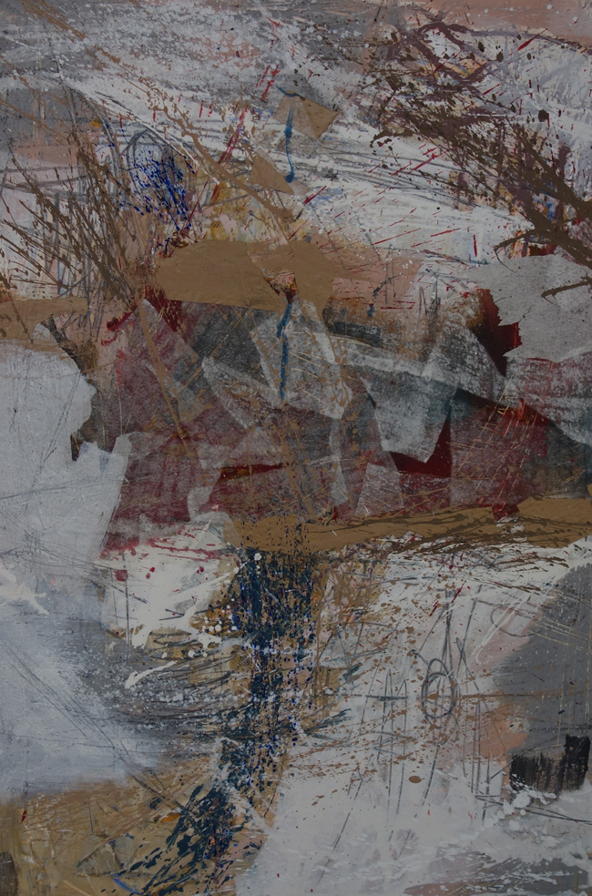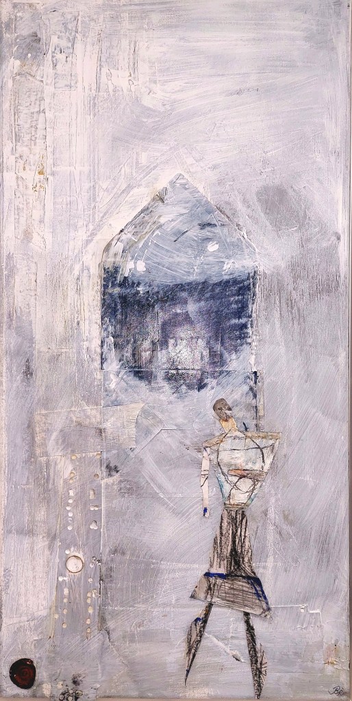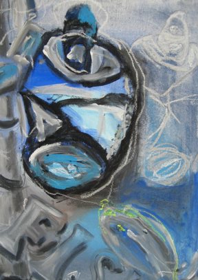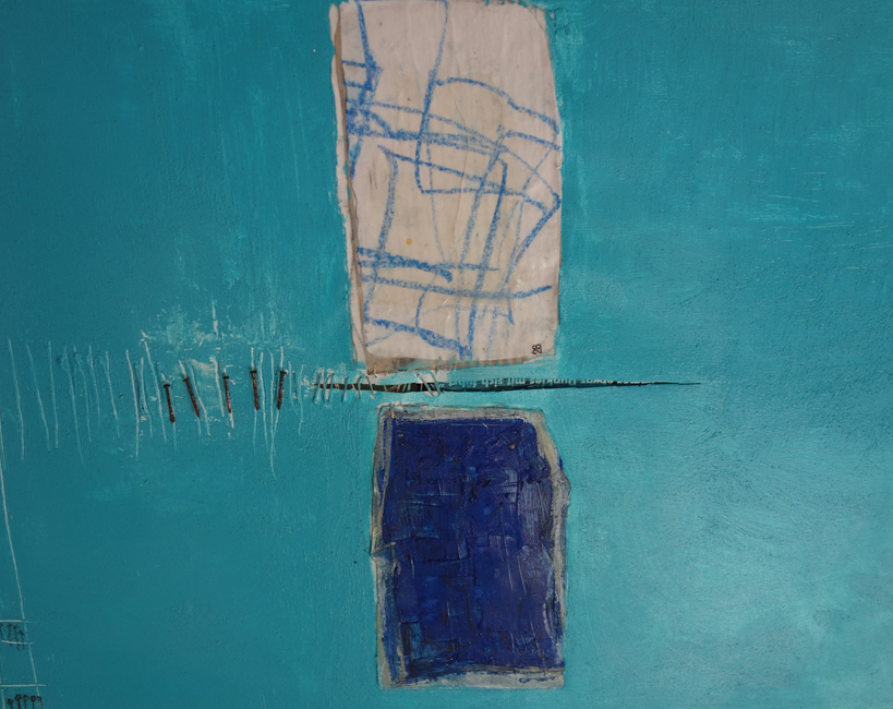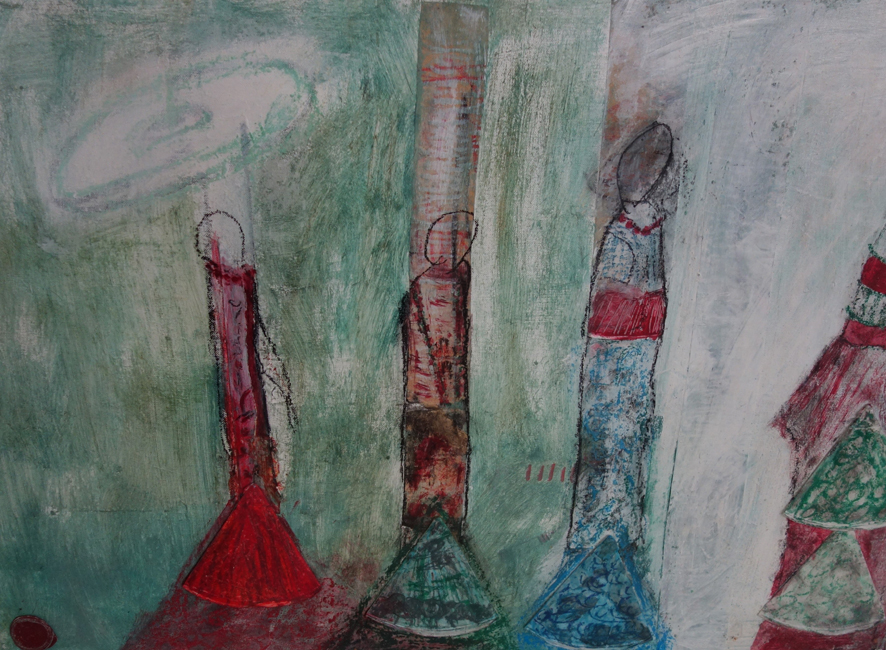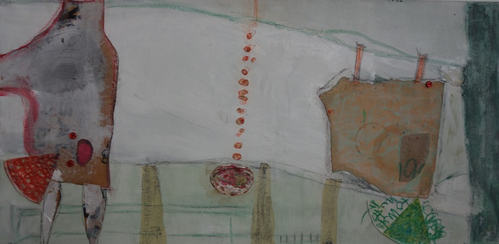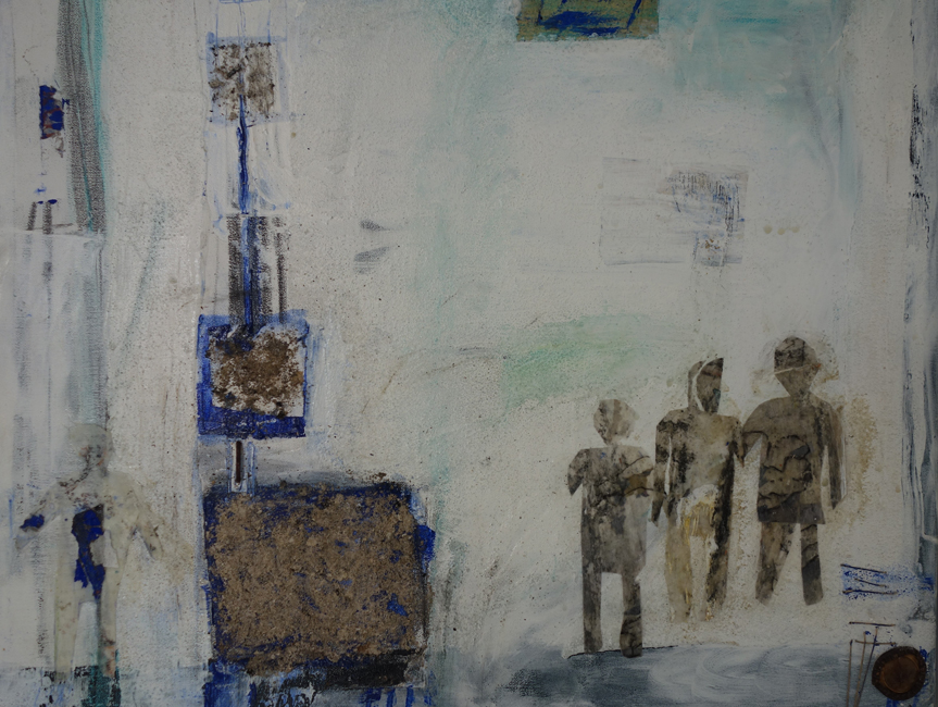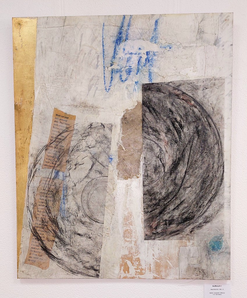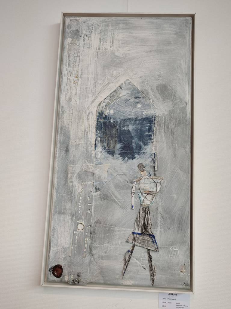 Bärbel Langowsky-Tafferner arbeitet ebenfalls mit harmonischen Farbgebungen, auch sie bewegt sich zwischen Gegenständlichkeit und Abstraktion. Dazu benutzt sie verschiedene Montagematerialien, unter anderem Papier und Faden. Die Farben sind fein und zart in Flächen und Linien auf die Collagen gesetzt, flüchtig und vergänglich, schattenartig reisen die Figuren durch ihre Zwischenwelten.