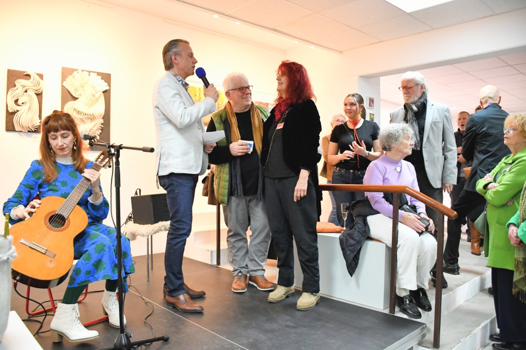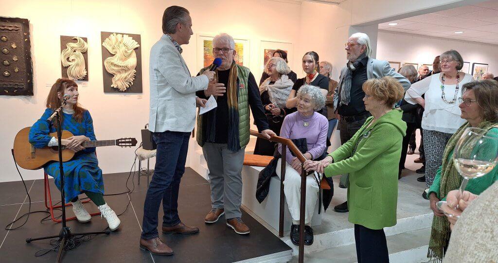 Vorsitzender Klaus Seeger interviewte Gerhard Postler und die beteiligten Künstler im M11. Links die Sängerin und Gitarristin Chantal Fatale aus dem württembergischen Schorndorf, die die Vernissage musikalisch begleitete. Foto: Falk