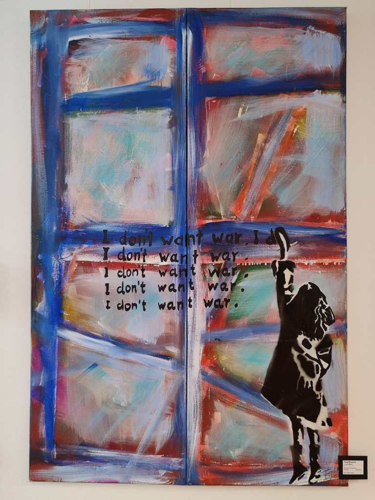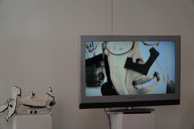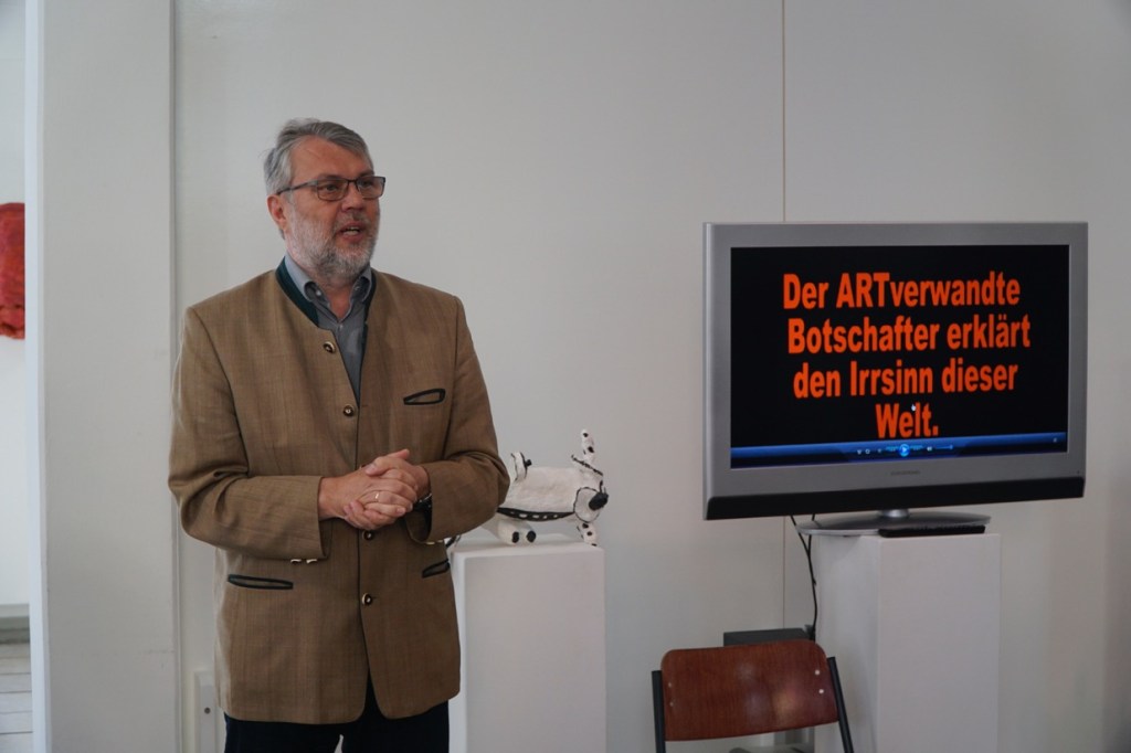 Noch während der Botschafter der Kunst-O-Nauten zu Beginn der Vernissage in der KunstSchranne via Videobotschaft versuchte den Irrsinn dieser Welt zu erklären, wurde die Verbindung plötzlich durch einen hörbaren militärischen Angriff unterbrochen – nur noch weißes Grießeln war zu sehen…