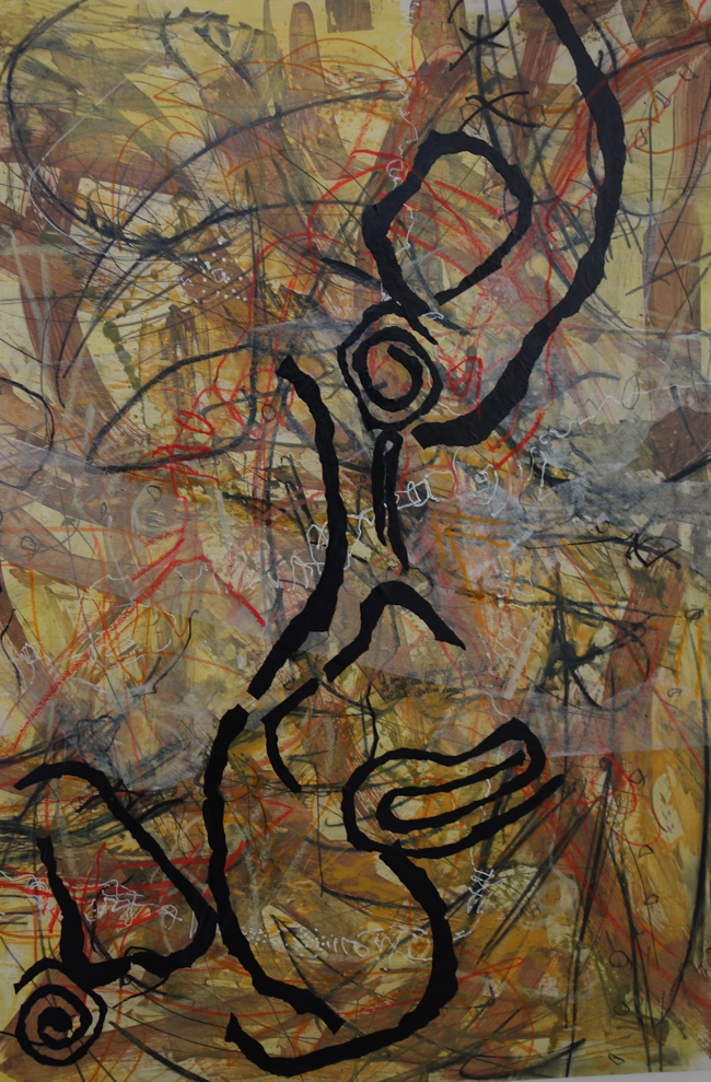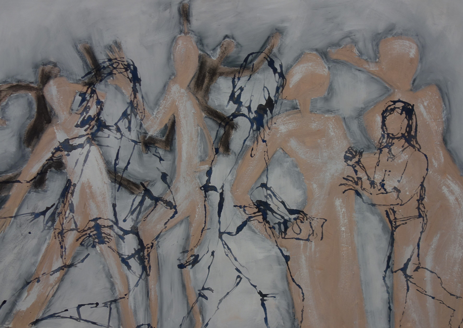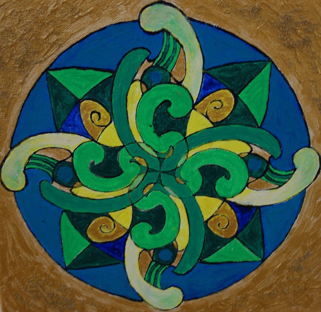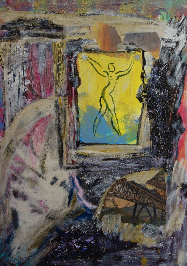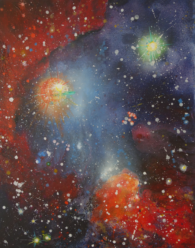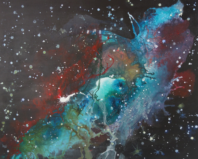 Ganz ruhig wird es bei Elisabeth Arnold, die mit ihren Mandalas in den Bereich der Meditation eindringt. Energie auf einem niedrigen Level. Dies ist ihre eine Seite, die andere ist sehr experimentierfreudig: Abflussrohre werden als galaktische Weltraumbabies interpretiert, Katzen ins All gebeamt und weibliche Akte lässt sie zu den Sternen tanzen.