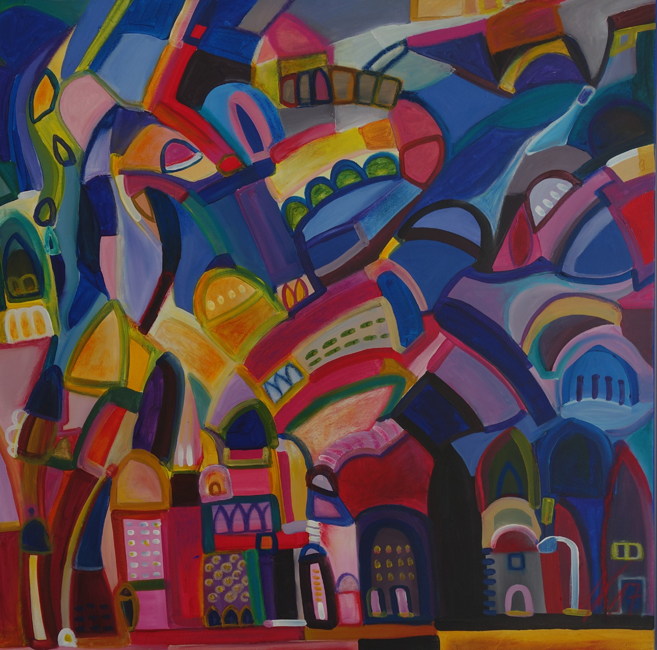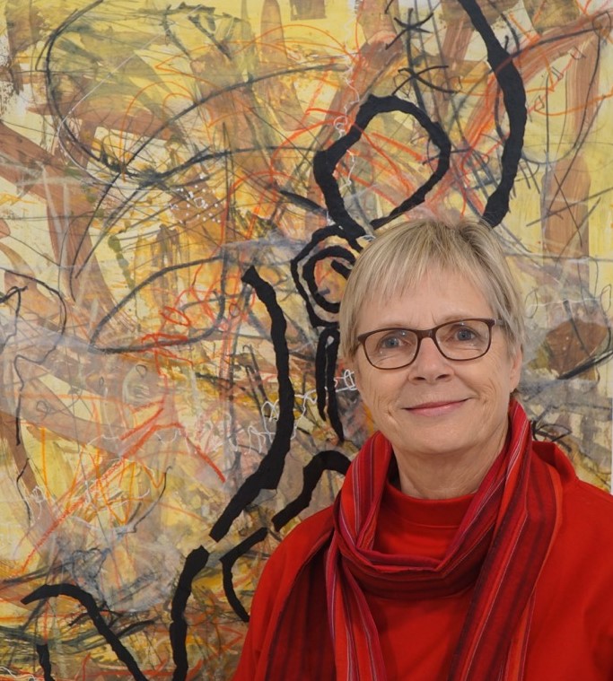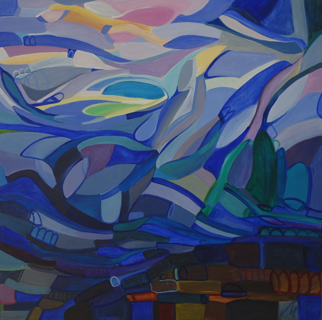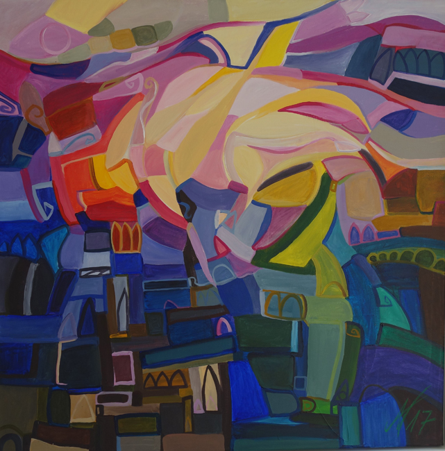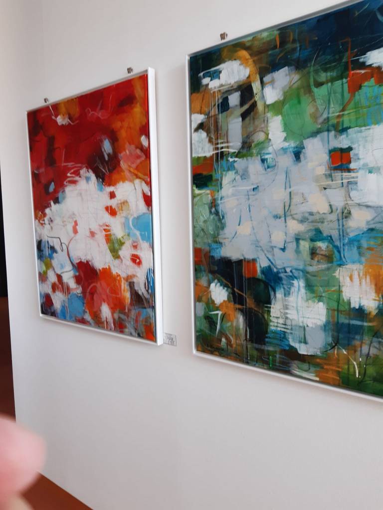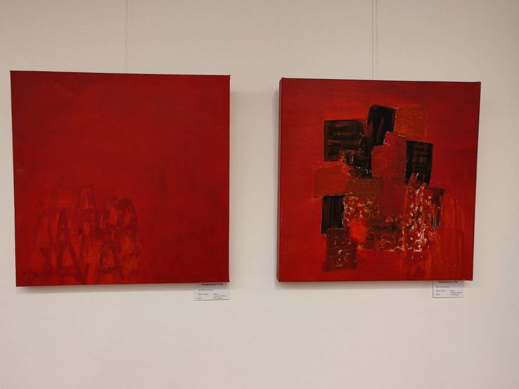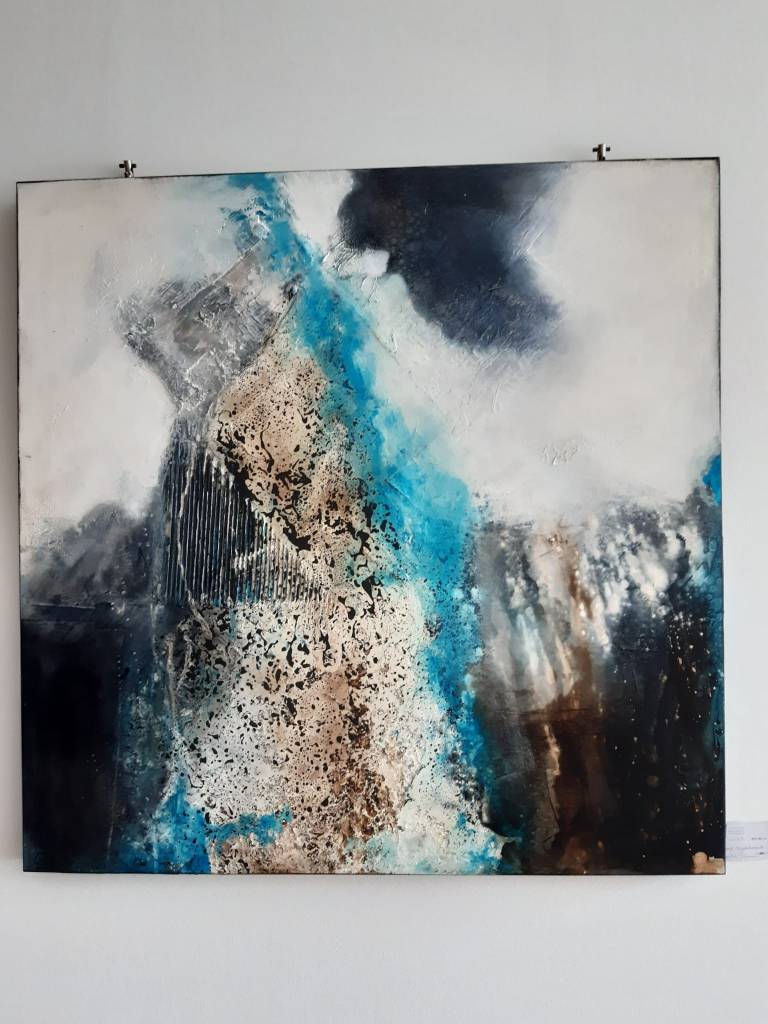 In den Arbeiten von Angelika Wolf wirken ganz andere Energien, hier geht es um Stille und Harmonie. Oft Ton in Ton gemalt, gelingt es der Künstlerin Landschaften, die in den Himmel wachsen, auf die Leinwände mit Acryl zu malen. Sie zerteilt sie in Farbfelder und so entstehen viele abstrakte Formen, die Platz für eigene Interpretationen und Deutungen zulassen.