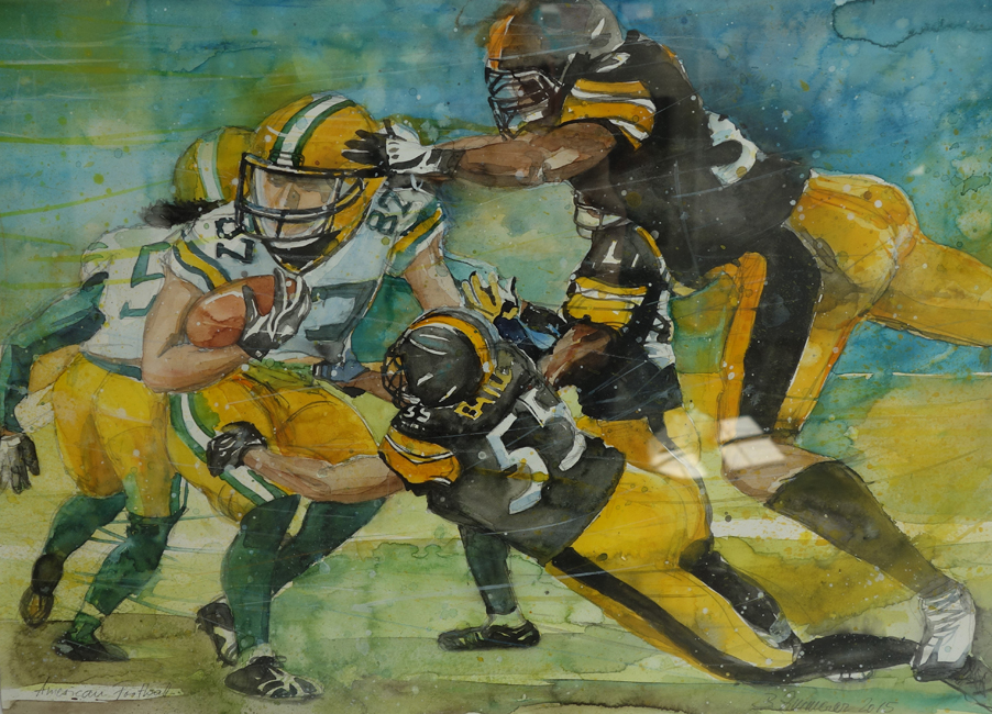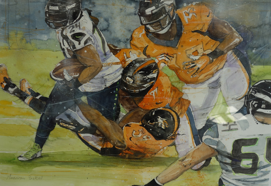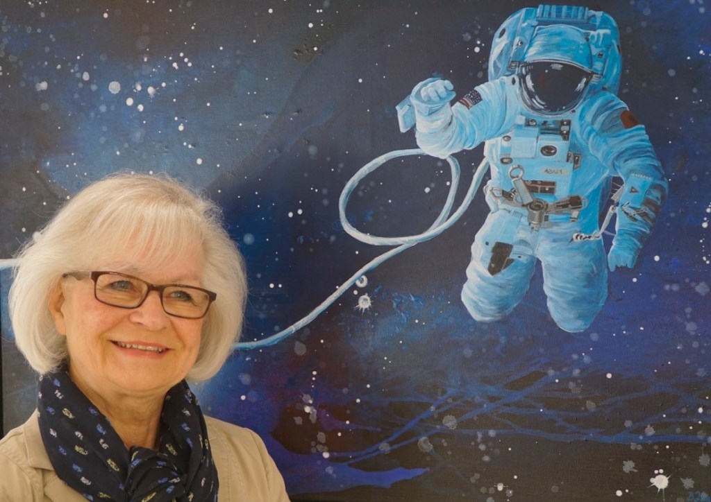 Da schwebt er nun, schwerelos im All und nicht ganz losgelöst; nur mit einem Kabel verbunden, der einsame Astronaut. Das fotorealistische Gemälde von Brigitte Zimmerer ist ein echter Hingucker. Ihr gelingt es den Energieaufwand ihrer Protagonisten eindrucksvoll darzustellen: Rugby- und Fußballspieler zeigen mit vollem Körpereinsatz, welche Kräfte in ihnen stecken. Gegenüber stellt die Künstlerin noch gewaltigere Kräfte dar: ihre Interpretationen von im Chaos entstehenden Sternen, explodierenden Galaxien, Sternen- und Spiralnebel.